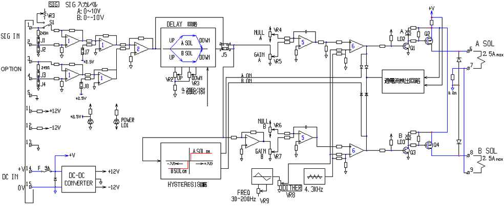 両ソレノイドバルブの場合、0~+10VでA-SOLが、0~-10VでB-SOLが出力します。